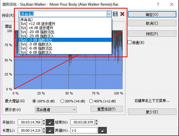 比如,为了实现音乐渐渐淡去的效果,小编选取了“-3dB指数淡出”的预设。