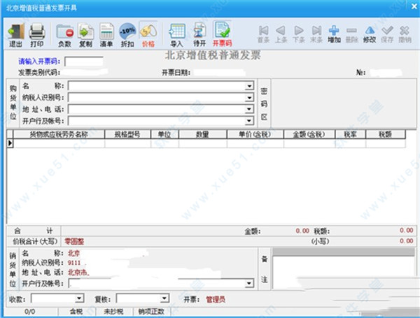 2、假如进入北京增值税专用发票界面,我们是在普票填列的基础上,再加填“地址、电话”、“开户行及账号”。