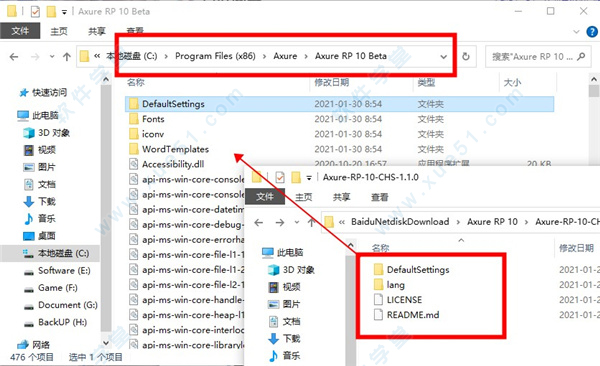 2、因为软件是英文版,需要对它进行汉化,将Axure-RP-10-CHS-1.1.0内全部汉化补丁复制到软件安装路径下。