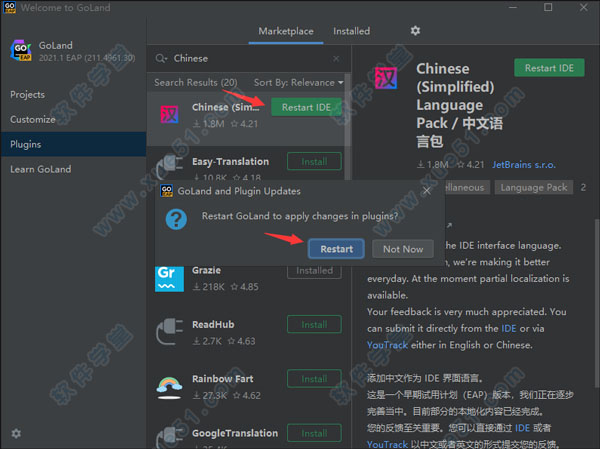4、这个时候点击“restart ide”会弹出提示重启框,点击“restart”重启软件。