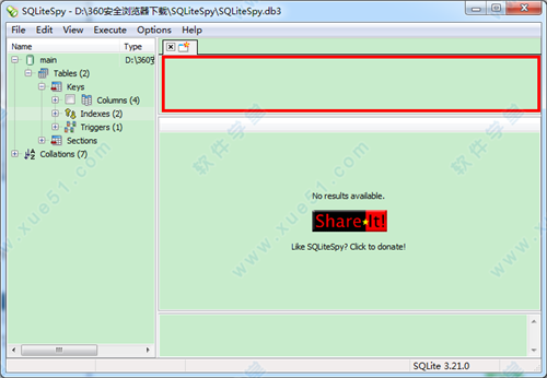 SQLiteSpy是一款针对sqlite3数据库进行可视化管理的工具,不需要安装,只需将该软件提起到任何目录和执行文件就能立即开始工作,软件是一个独立的管理工具,他不会与数据库中的文件及程序产生冲突,操作起来非常方便。用户只需懂基础的SQL语句就可以轻松完成建立新的SQL查询,视图,复制和删除表、编辑单元格,以及查看索引,触发器和排序规则等操作,非常便捷。