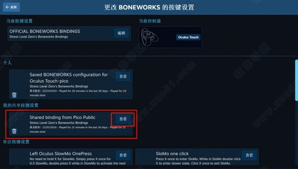 7、在“社区按键设置”内找到“Shared binding from Pico Public”,点击“查看”按钮。