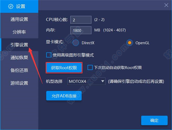 2、将设置窗口切换至“引擎设置”栏,直接点击其中的“获取Root权限”按钮。