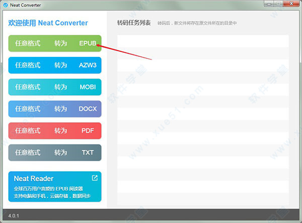 1、安装完成后可直接打开软件,在功能列表中提供了任意格式转为EPUB、任意格式转为AZW3等多种功能;