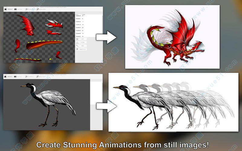 Creature Animation Pro是一款功能强大的二维动画快速制作软件,相信喜欢动画制作的朋友一定听过或者使用过它。该软件拥有强大的动画制作生成工具可以帮助用户快速制作出各种动画形象,并且通过骨骼和动作的设定,让动画效果显得十分的逼真和细腻。让你能够轻松的将一个静态图像生成动态效果,有效减少艺术需求,并且它还可以使用自动程序动画来节省用户制作时间,体积小巧功能强大,非常适合游戏开发者、数字艺术家和