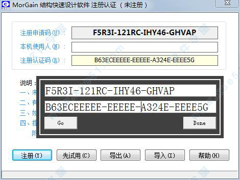 3、再打开注册机,把申请码复制进去,点击“GO”就可以生成认证码