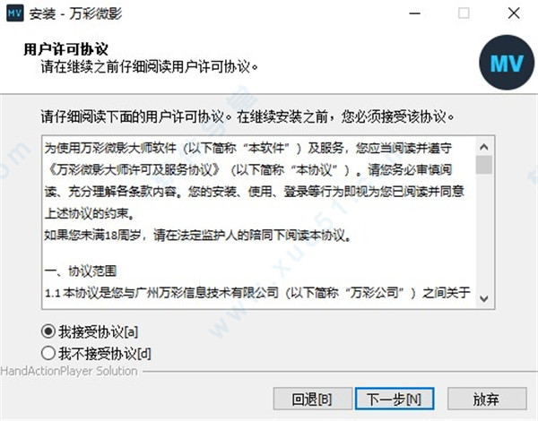 3、软件安装协议,确认无误能接受之后勾选我接受协议,再点击下一步继续安装。