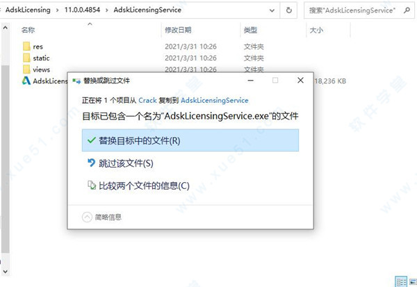 7、将AdskLicensingAgent.exe复制到Autodesk SharedAdskLicensing11.0.0.4854AdskLicensingAgent,点击替换目标中的文件。
