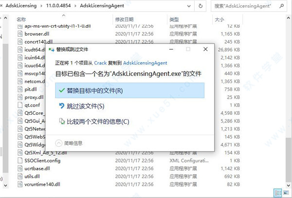 8、将adlmint.dll复制到Autodesk SharedAdskLicensing11.0.0.4854AdskLicensingAgent,点击替换目标中的文件即可完成破解。