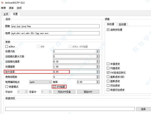 2、点击上方的“设置”选项卡,找到“放大倍率”,这一项根据自己的需求填写,可以先用一个比较短的视频试一试。下方的“GPU加速”前要打钩。
