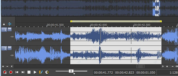 小编将会以转换左右声道为例,为大家演示Sound Forge声道转换器的用法。如图2所示,首先准备一个设置有左右声道不同内容的音频,并选取其比较明显的不同部分。