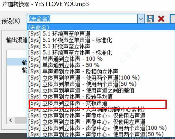 1、如图所示,声道转换器的预设选项中包含了多种声道转换方案,比如,小编需要切换左右声道,就要选择其中的“立体声到立体声-交换声道”选项。