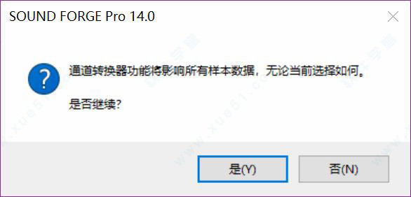 3、在进行声道转换前,Sound Forge会弹出警告。小编上述的音频片段左右声道转换的操作,一般不会对所有样本数据造成影响。该警告一般是针对立体声转换为单声道等操作使用。