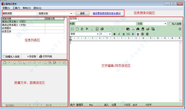 锦鸿记录本是一款非常实用的图文信息记录软件。它的主要功能就是帮助用户保存图文、网页、图片及各类文件资料,让用户的生活更加的有条不紊。同时它还有有网页浏览、 图文编辑、图片阅览功能,比如查找、替换、复制剪切粘贴等,让用户在软件界面操作起来更加的方便、快捷。锦鸿记录本软件可以快速地对信息库内的信息进行全文搜索,查找出您所需的信息。喜欢的朋友欢迎前来下载,相信一定会是您学习、工作、生活的好帮手。