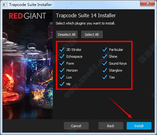 AE里能够随心所欲地创建理想的3D场景。软件由运动图形和视觉特效师Peder Norrby开发,拥有更为强大的粒子系统、三维元素以及体积灯光,让用户可以在AE里能够随心所欲地创建理想的3d场景。同时显著更新了TrapcodeParticular,Shine,Mir以及Sound Keys,Starglow和Form新的功能。ps:安装trapcode suite 14之前需安装After Effects2014以上版本,不然会报错,本站同样提供