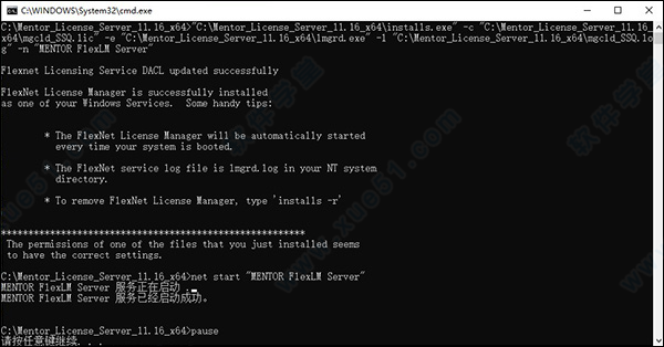 6、然后以管理员身份运行“ Mentor_License_Server_11.16_x64 server_install.bat”文件,后等待新服务安装并启动;