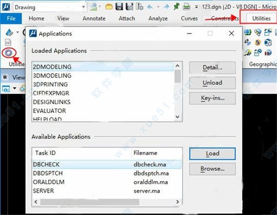 5、运行MicroStation软件,首先在菜单栏依次选择Utilities-MDL Applications(齿轮图标),在下方的Avaliable Applications中选择tScan模块加载,如图所示。