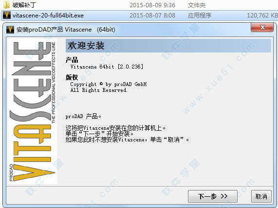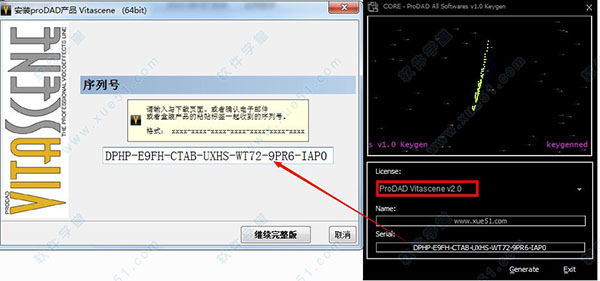 2、打开注册机,选择软件prodad vitascene 2.0,随便输入一个名字,就会生成一个激活码,复制激活码到软件安装窗口中