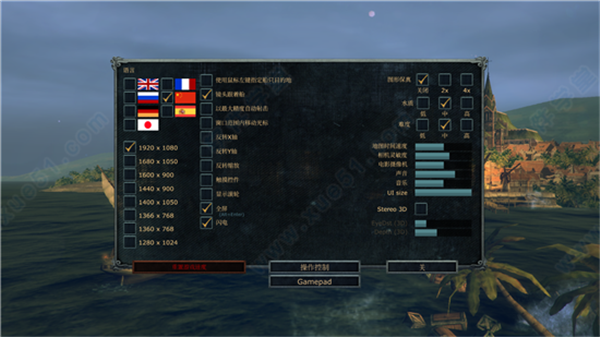 4、点击设置,我们可以自定义屏幕分辨率、音乐、相机灵敏度、语言、镜头跟着船等参数。