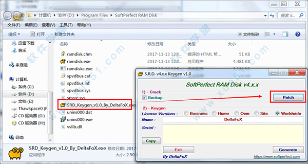 4、将“Keygen”文件夹中的“SRD_Keygen_v1.0_By_DeltaFoX.exe”注册机复制到软件的安装目录下,默认安装目录:“C:\Program Files\SoftPerfect RAM Disk”。