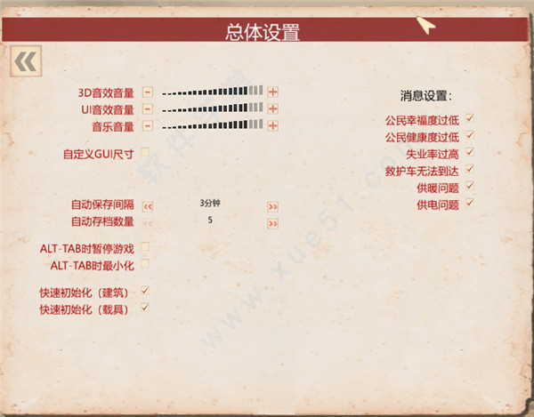 3、进入设置界面,点击总体设置,我们可以自定义3D音效、音乐音量、自动存档间隔和数量等等。