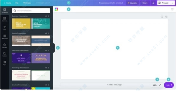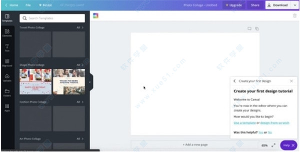 3、侧面板编辑器的侧面板是访问设计模板和元素的地方。模板、元素、文本、上载、文件夹和应用程序。