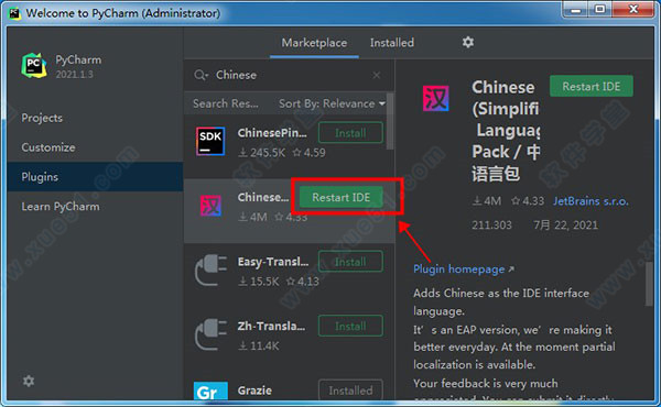 7、安装好插件之后点击插件右边的RESTART IDEA。