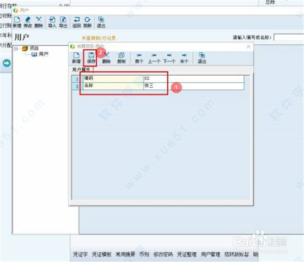 4、在核算项目-用户界面,输入【用户编码】和【用户名称】,点击【保存】即可。