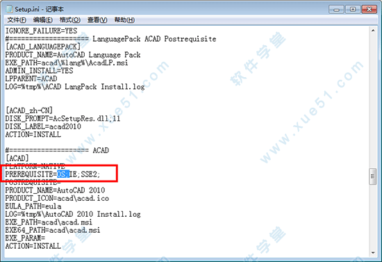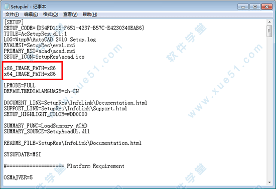 2、用记事本打开根目录下的“setup.ini”这是安装配置文件,修改软件同时兼容32位与64位,需要修改的地方有: