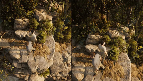 游戏多数时候是双人双屏游玩,那游戏在遇到需要对双人同时进行事件叙述时,为了凸显对接下来游戏中出现的冲突或转折的重要性,逃出生天选择了将屏幕合二为一进行叙事,但要将两名玩家的屏幕突然合为一块势必会有种突兀的感觉,游戏在这方面当然也做了处理,在一些章节中也做得十分出色,例如文森特先跨过一道断崖,里奥跃过来抓住文森特的手,玩家两人同时按住按键互动,再将游戏的镜头合二为一展现这个壮观的合作镜头,镜头再拉向前方的灯塔(展现目标),此后屏幕重新一分为二。这一系列的镜头切换让游戏的衔接变得尤为自然,几个镜头让玩家感受到了合作的刺激体验的同时还交代了游戏接下来的目标,这样的设计游戏有非常多。