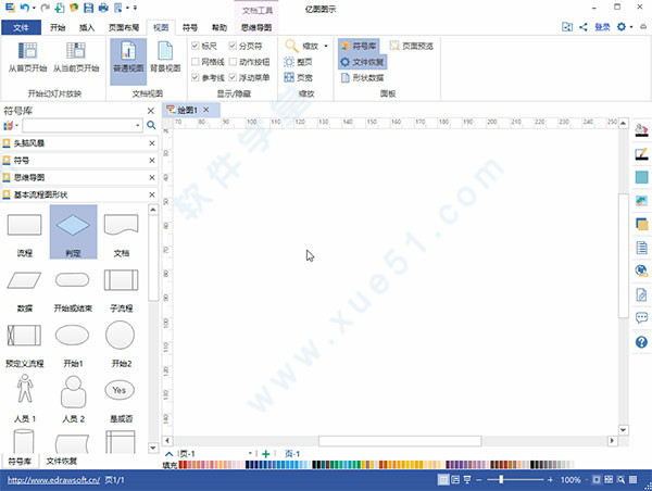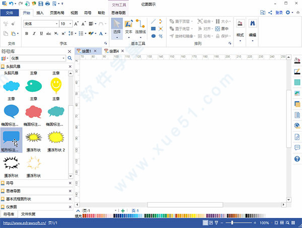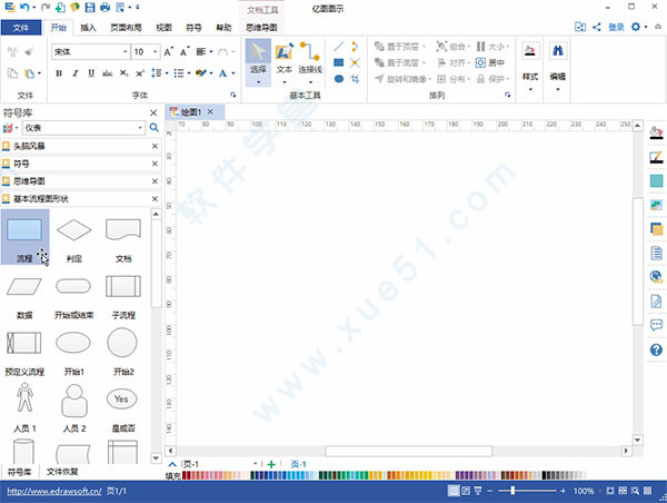 【连接形状】在打开模板或者例子的时候,相关的符号库就会被打开。只需将您需要的形状符号拖拽到绘图页面即可开始绘图。