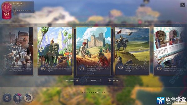 策略游戏。游戏题材新颖独特,玩法丰富多样, 它以人类的文明发展进程为主线,在这里我们将扮演其中的一员参与到历史时代的发展中,感受从远古石器时代到近现代的60多种历史文明,体验各种时代战争。游戏地图广阔,画质精良,每一个游戏画面都是参考了历史真实事件改编,致力于为玩家完美还原真实的历史文明。游戏中,玩家可以根据自己的喜好,自定义创建一个虚拟形象扮演某一个时代社会的领袖,随着你带领的社会文明发展,你的虚拟形象将在游戏进程中也会在视觉上发生变化,通过你对元进度系统领袖等级的提升,还可以解锁自定义外观,在游戏中向陌生人和朋友展示。该游戏共为玩家提供了六个时代,每个时代中都有十几种不同文明可由玩家自由选择,每种文明都有其自身的发展特点和加成效果,有的注重经商,有的注重战斗,玩家可以根据自己的喜好打造出一个专属于你的文明。