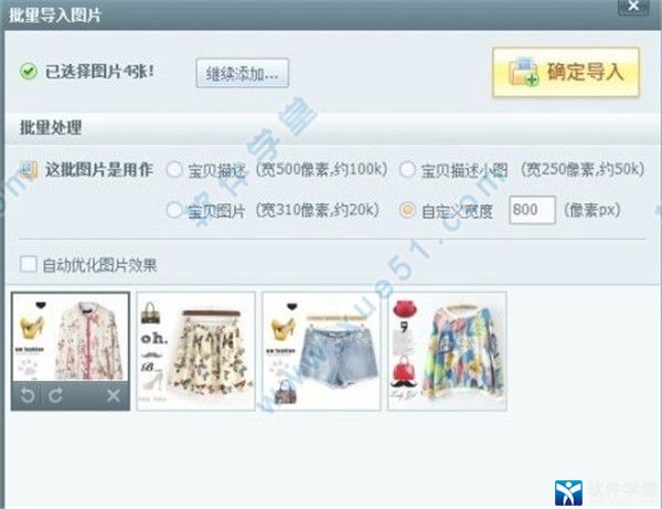 3、在确认导入的界面,可以一直把所有要处理的图片都添加进来,在这个页面会对所有选中的图片进行一个尺寸的处理,目前淘宝的宝贝图片即商品页面标题和价格左侧的那个图框位置尺寸是400像素的,如果想要有光标移到图片上有放大效果的话,要是最低700像素的。而宝贝描述即商品页面下面的展示宝贝的区域的图,这里实际宽度目前是750像素即可。大太也没什么意义,打开显示也会慢,所以这里可以用自定义尺寸设置你需要的宽度即可自动优化的话,不建议选择 最后点击右上角的确认导入即可。