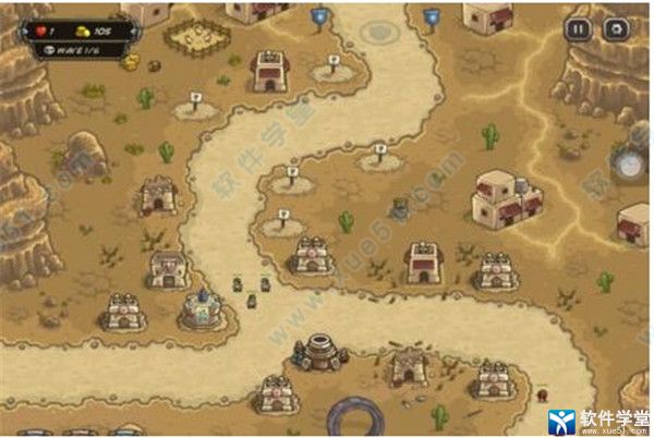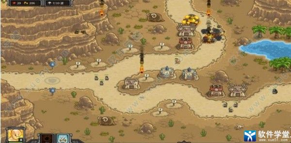 攻略:本关的重点在于死守中央路口,初始布局建议左侧弓箭塔,魔法塔;中下部弓箭塔,炸弹塔;右侧弓箭塔;中部步兵塔,弓箭塔(参考图片一)。有资金后在中部补充1座弓箭塔,1座步兵塔以稳固中央防守,增援还是冷却就用。然后升级,本关的塔可以升1级,优先升级中央的步兵塔,然后是左侧的魔法塔,再后是中央的弓箭塔和中下的炸弹塔。本关二级沙漠兵较多,在其于中央集中时用火雨。后期可酌情在后方补箭塔,总的来说本关难度不大,我通关时还有600多金。