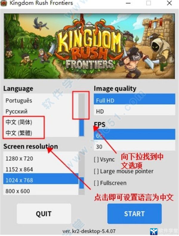 1、如下图所示,进入游戏前,在语言选项中下拉,找到中文并点击,游戏就会切换成中文界面。