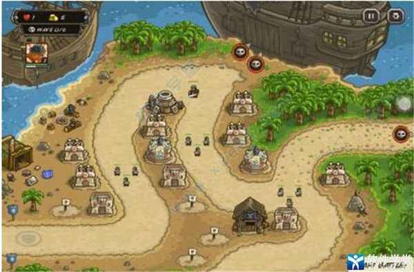 攻略:本关开始英雄可以上场,大家可以把英雄练满级再打,会比较给力。我上场的是7级战士,也够用。英雄开始时摆上方路口,初始造塔上方摆一个炸弹塔,中间和右面各放一个魔法塔,其余兵营和弓箭塔。右侧第一波用增援守一下,有钱后招2个海盗堵右边。优先升级中上的炸弹塔到顶级,然后升级中间弓箭塔到顶级,升级鹰眼增加射程。然后升级右上的弓箭塔以及右边的弓箭塔,魔法塔。本关前4波敌人都较易应付,第5,6波压力较大,特别是第6波有多个死灵召唤师,注意及时升级各个塔楼,重点升级弓箭塔配合连射技能,钱是比较充足的。本关英雄需要来回调动,左中右哪条防线吃紧就去哪边,注意步兵被火炮炸死后要及时使用增援,特别是右侧的钻地怪,很容易漏过。