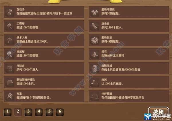 塔楼专家:建造8种高级塔。 打法:全数造出8种高级塔即可,可使用后期关卡刷塔,因为初始金钱较多。