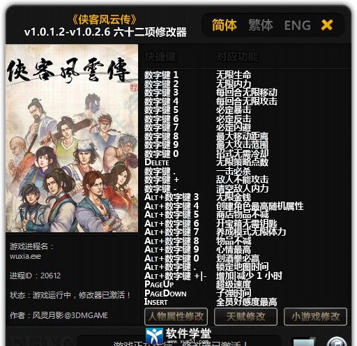 侠客风云传PC修改器,该版本软件针对游戏的PC版本,并且无需安装完全免费,感兴趣的用户可以在本页面的下载链接处进行下载。