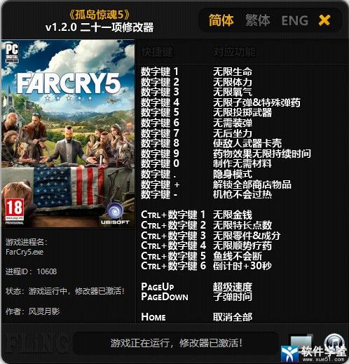 3、启动修改器完成初始化即可根据用户界面快捷键提示使用对应功能。