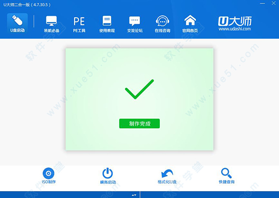 大师u盘启动盘制作工具是一款将U盘制作成启动盘的U盘制作软件,今天小编在这里来给大家介绍现在最新的版本:二合一版,它是由专业版和UEFI版的完美合一,它结合这两个版本的功能和特色,使得它的ISO制作更加的强大、格式化U盘也更加的有效,它的查询功能也免得更加的全面。u大师u盘启动盘制作工具可以更加方便有效的制作出一个一盘两用的U盘,让你可以对调你的光驱,随时随地就能完善你的系统随时随地进行ISO制作。
