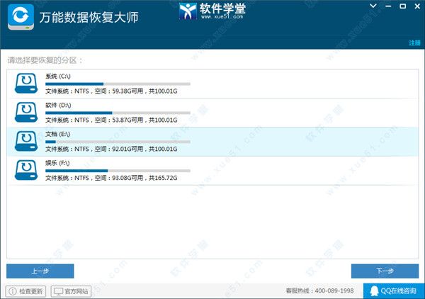 2、选择需要恢复的硬盘分区,(如果外接设备,请在运行软件前连接好),点击“下一步”开始扫描;