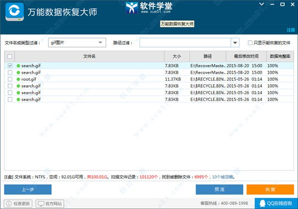 3、从扫描结果里搜索要恢复的文件,选择要恢复的文件,点击“恢复”按钮;