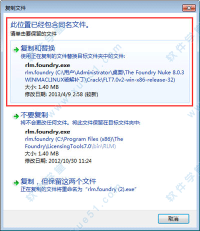 6、进入Crack文件夹,复制FLT7.0v2-win-x86-release-32下的“rlm.foundry.exe”文件到C:\Program Files (x86)\The Foundry\LicensingTools7.0\bin\RLM覆盖掉原文件