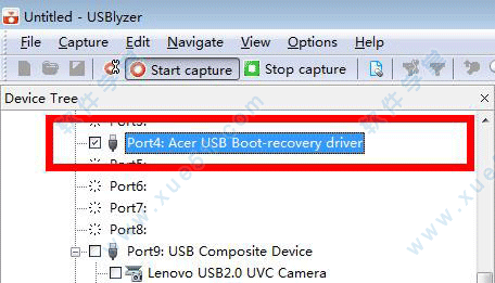 2、选择嗅探器检测到的设备“acer usb boot-recovery driver(宏碁USB启动恢复驱动程序)”,然后点击 star capture“开始捕捉”按钮