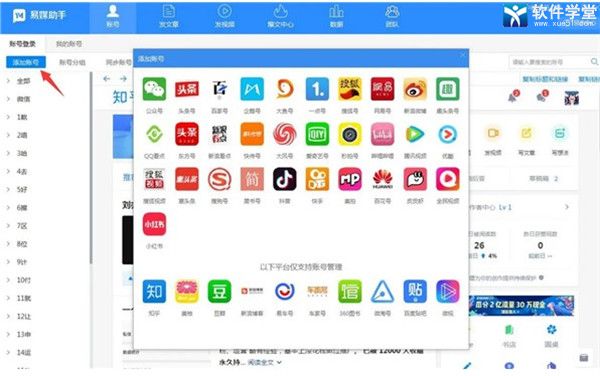 1、首先,将易媒助手打开。在其主界面的左上方点击“添加账号”。并在它弹出来的添加账号窗口将需要发布的平台添加进来。