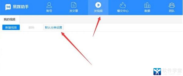 3、如何将内容同步到多个平台?接下来,以易媒助手将视频内容同步到多个平台为例子进行讲解。点击“发视频”的“默认分类设置”。