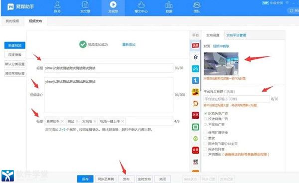 7、将视频添加成功后,用户需要填写标题、视频简介、平台独立标题和选择标签、视频封面,再点击界面下方的“发布”按钮。
