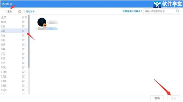8、接着,软件就会弹出选择账号的界面,用户选择要发布的账号。如果用户想将内容同步发布到所有平台,就勾选“全选”的复选框,再点击右下方的“发布”按钮。