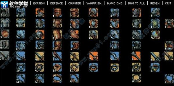 从左到右依次是 基础,攻速,闪避,防御,反击,吸血,魔法伤害,群体伤害,回复,暴击。