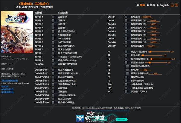 闪之轨迹4修改器是专为同名游戏制作的一款非常好用的游戏修改辅助工具,它可帮助用户修改多项游戏修改功能,让你能够更好的上手,轻松体验游戏乐趣。这款游戏是由Falcom发行的一款经典回合制角色扮演类游戏,同时它也是闪之轨迹游戏的最新续作,它包含了超越前作的所有游戏内容,大量丰富的精彩游戏故事剧情与庞大的世界观,为广大玩家们打造了一个奇幻的异世界,在这里我们将体验全新的游戏玩法。该游戏还为玩家提供了众多丰富的角色人物,每一位角色都有其不同的技能属性与特色玩法,玩家可自由选择培养。由于该游戏难度较大,本次小编为大家带来了